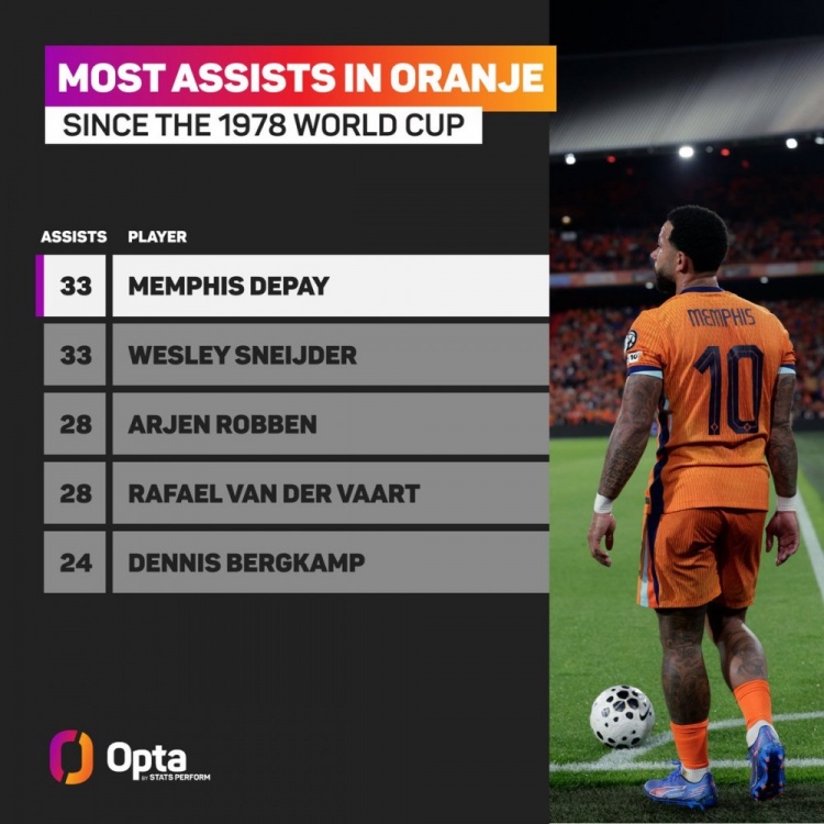 据统计,自1978年世界杯至今,德佩已成为荷兰队史并列助攻王。