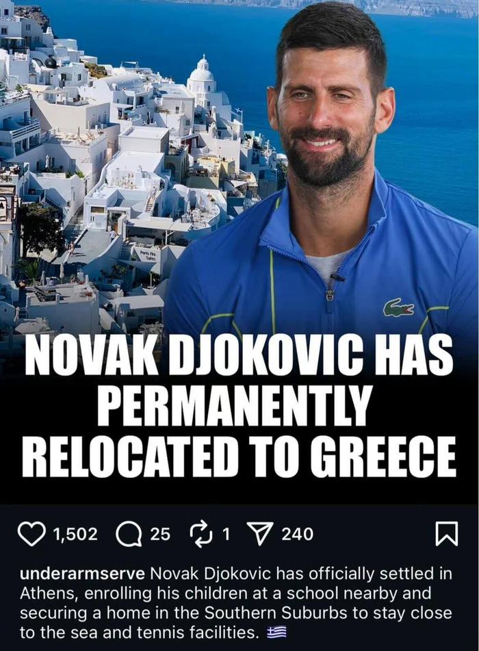 近日,根据希腊媒体的消息,德约科维奇已正式落户雅典南郊格利法达地区,其子女即将入读当地学校,这位24届大满贯冠军得主也在积极适应希腊的新生活。