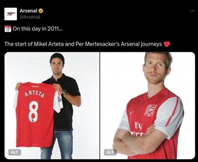 直播吧8月31日讯 在2011年的今天,现任球队主帅阿尔特塔以及默特萨克开启了枪手生涯,阿森纳官推也晒出两人当时的照片作为纪念。阿尔特塔是在2011年由埃弗顿转会加盟阿森纳,共计为球队各项赛事出场150场,贡献16球10助攻,在2019年开始担任枪手主帅。德国后卫默特萨克则是为阿森纳出场2...